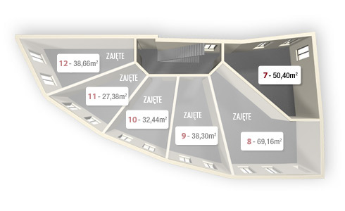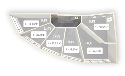Poniżej przedstawiamy wszystkie dostępne pomieszczenia, z zaznaczeniem ich powierzchni i unikalnych numerów, którymi należy posługiwać się przy rozmowie w sprawie najmu.