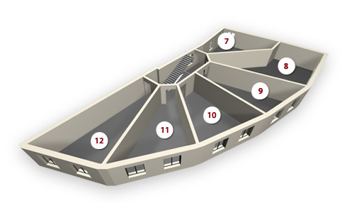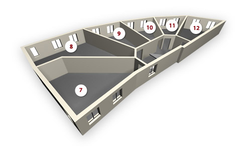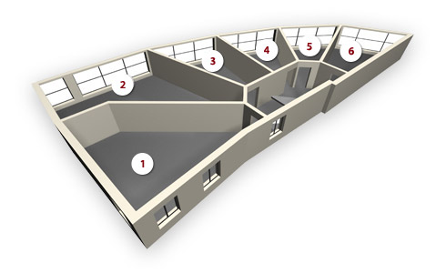 Sześć obszernych pomieszczeń na pierwszym piętrze o łącznej powierzchni biurowej od 27 do 100 m2. Czoło oszklone – witryna.